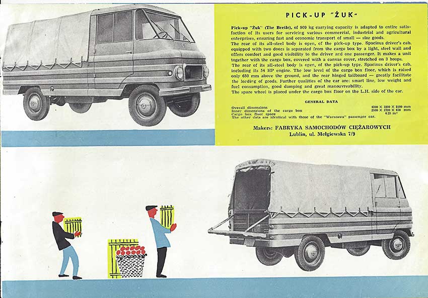 Such a utility of 0.9-ton pickup ŻUK A-03 on the basis of units Warszawa M20 (including Nizhnekamsky 52-HP engine S-20) was developed by the engineers S. Tang, R. Squarecom and Yuri Kaminsky just on the FSO plant and the name ŻUK ("beetle") the car got for specific "persons not General expression". The prototype was shown at the industrial exhibition in poznań in 1958, where it received positive reviews. The first pilot series of the fifty machines were assembled in Warsaw in the same year. After proper testing, the production in 1959 was transferred to FSC Lublin.