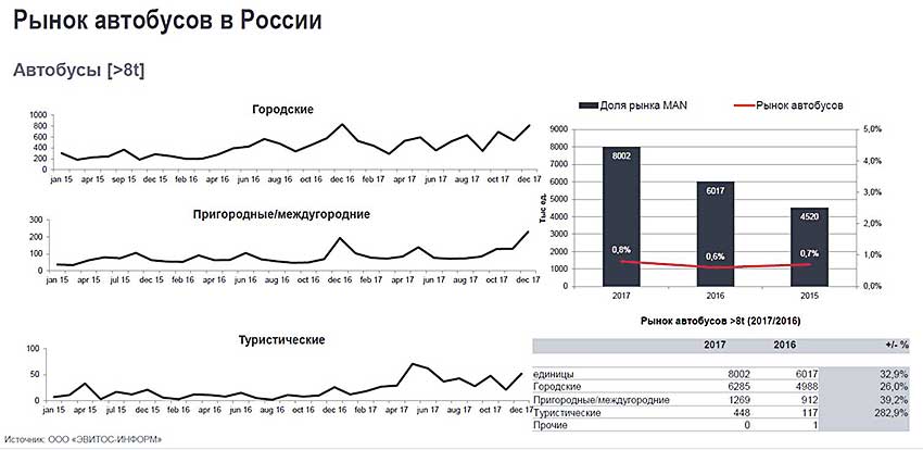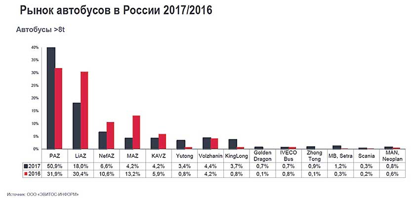 Among the "Big seven" of sales of buses for the urban segments of the model are missing completely, as their purchases of imported cars banned from mid-2015 year and in rest MAN Neoplan distributed fairly evenly compared competitors. At share on the market of the European brands declined to 26% 30% 2016.