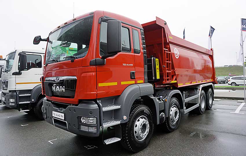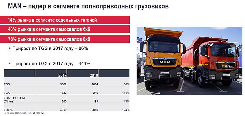 In the segment of construction trucks MAN captured 24% of the market (in the photo model MAN TGS 41.440 8x4 BB-WW Euro-4 20 CC tippers BCM-59, can work in the trains weighing up to 80 tons)
