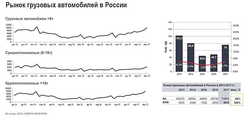General Director, LLC "MAN Truck end Bass RUS" Peter Andersson said that at according to analytical agencies, last year was the third in history sales of new trucks amounted to 71,1 (80,2) THD Segment of trucks with GVW over 6 t rose by 56%