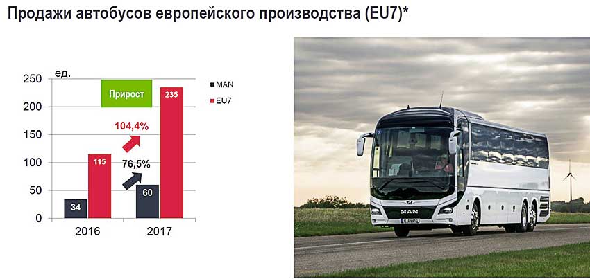 In the segment new buses saw an increase of registrations in the whole market (+33% to 8002 units), and EU7 among the brands that grew up in 2 times (+104,4%) to 235, E. D., and specifically brands MAN and Neoplan – on 76,5% to 60 units Share the market grew from 0.6 to is 0.8%.