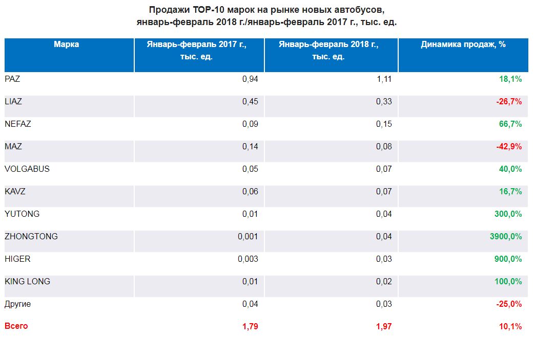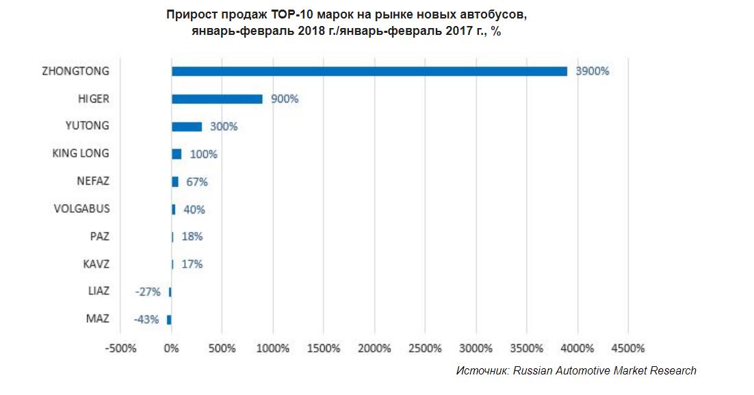 More than half of the market (56,3%) of the new buses is a brand of GROOVE. Thus, the volume of sales of PAZ buses in comparison with January-February last year increased by 18.1% to 1.11 thousand By the way, related brand KAVZ showed an increase of 16.7% to 0.07 thousand And, here business the second largest national producer of Likino bus plant (LIAZ) went much worse after the implementation of important contracts for Moscow and Moscow region. Thus, the registration of its mid-size and big buses fell by 26.7% – up to 0.33 million, which is, however, allowed to keep second place in the market with more than two-fold superiority over became the third NefAZ-om with its growth by 66.7% to 0.15 thousand Even worse in the Top 10 felt only Belarusian MAZ, falling 42.3% to 0.08 THD Even so-called "Other" brand of buses in the amount of only lost 25% (up to 0.03 million). Characteristically, places from 7th to 10th in the market were taken by the Chinese brands with a growth of 40 times (!) at Zhongtong bus (up to 0.04 million), a 10-fold have Higer (up to 0.03 K) and 4-fold at Yutong (up to 0.04 million) to "only" 2 times at King Long (up to 0.02 million). However, Chinese manufacturers brings poor dealer and service network, so sale is limited to one-time contracts and defined settlements.
