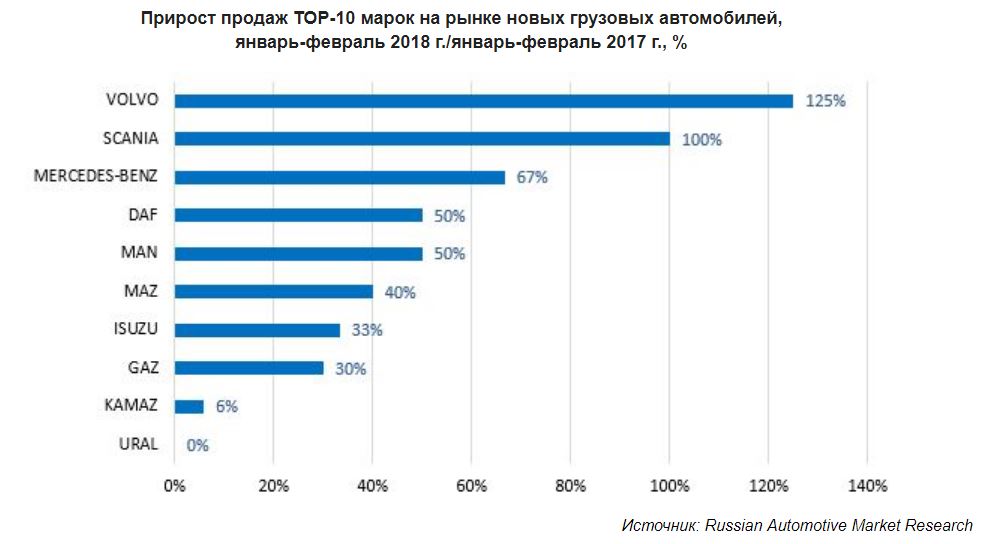 Freight cars of GAZ brand was repeated in February 2018, the same result for the same month of 2017, taking 12% of the market. For January-February sales "Pitch-ov" were 30% higher than the same period in 2017, and reached 1.3 million, However, related his Ural showed "zero growth" in sales of 0.4 thousand