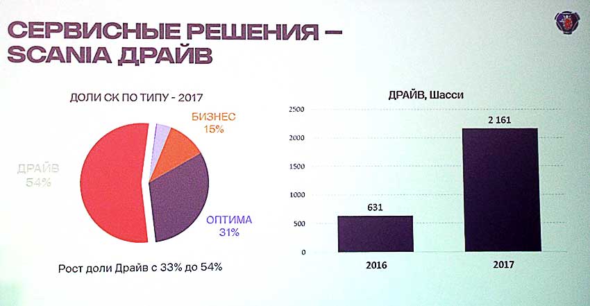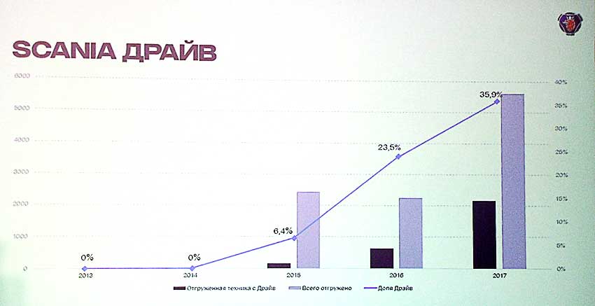 In July 2015 years, responding to customer needs, Scania has launched a new comprehensive product for effective control of the name "Scania Drive" that was the first step towards the active development of complex proposals. So, in 2017 about 36% (2160 units of chassis) equipment was equipped with a pack "Drive", and this result almost doubled the shipment of equipment from this package in 2016. Clients interested in further expansion of this program with the only growing, so the company is ready to offer our partners a new service package "Scania Drive", extended up to 5 years. There is a request and increase the duration of the contract up to 7 years.