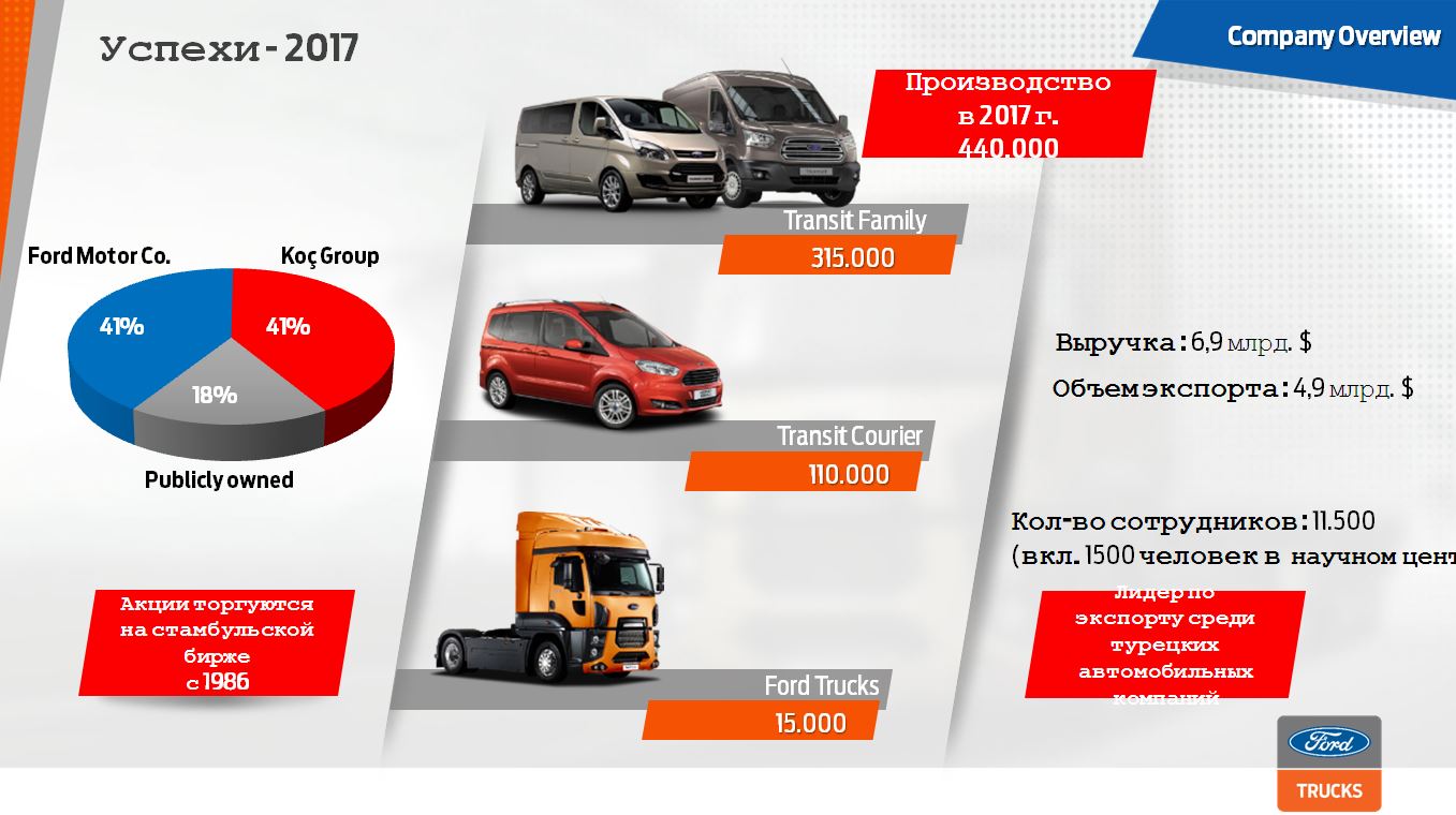 In 2017 Turkey has produced 110 thousand light delivery vehicle model Transit Courier, 315 thousand LCV series 15 thousand Transit and heavy trucks Ford Trucks. Revenue was $6.9 billion, while exported products were $4.9 billion, which was the best result among Turkish automakers.