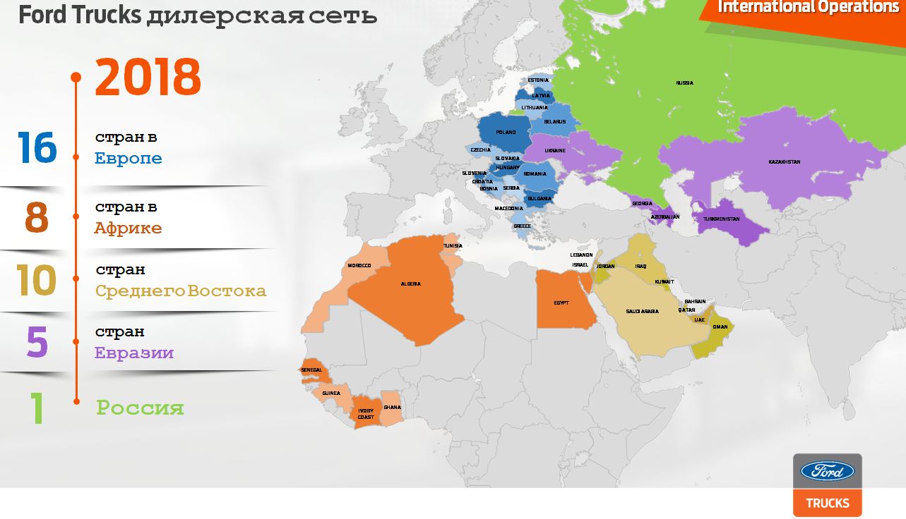 At present, Ford Trucks operates in Eastern and Central Europe, the middle East, Africa, Russia and the CIS and continues to develop an international network across three continents. In 2017 dealer network covering 28 countries. In 2018 their number will increase to 40, and by 2020 – to 50. This year the network will cover 18 countries in Europe, 8 countries in Africa, 10 countries of the Middle East, 5 countries of Eurasia and, of course, Russia.