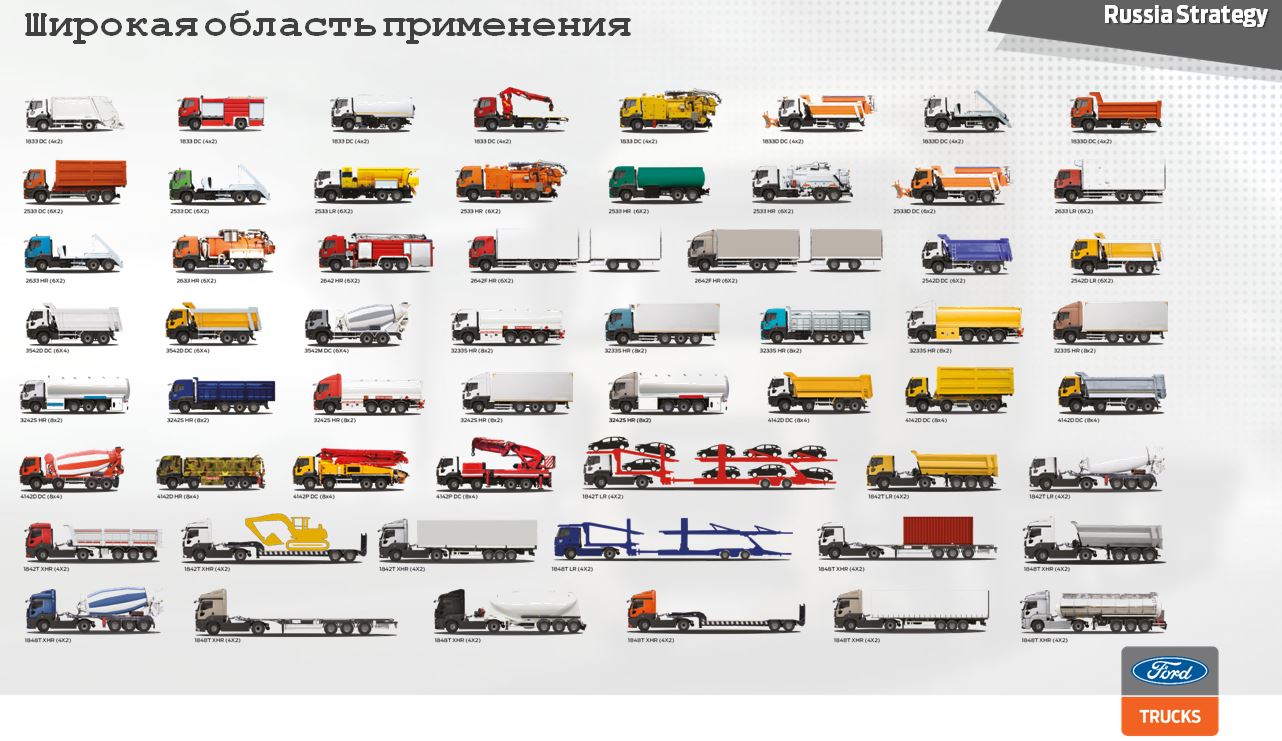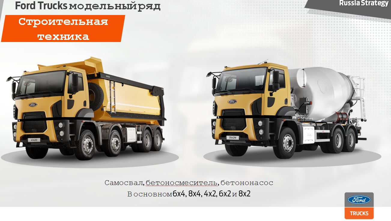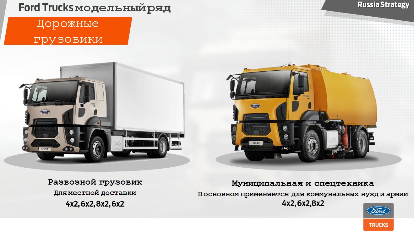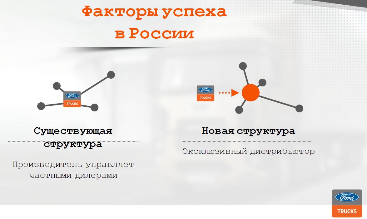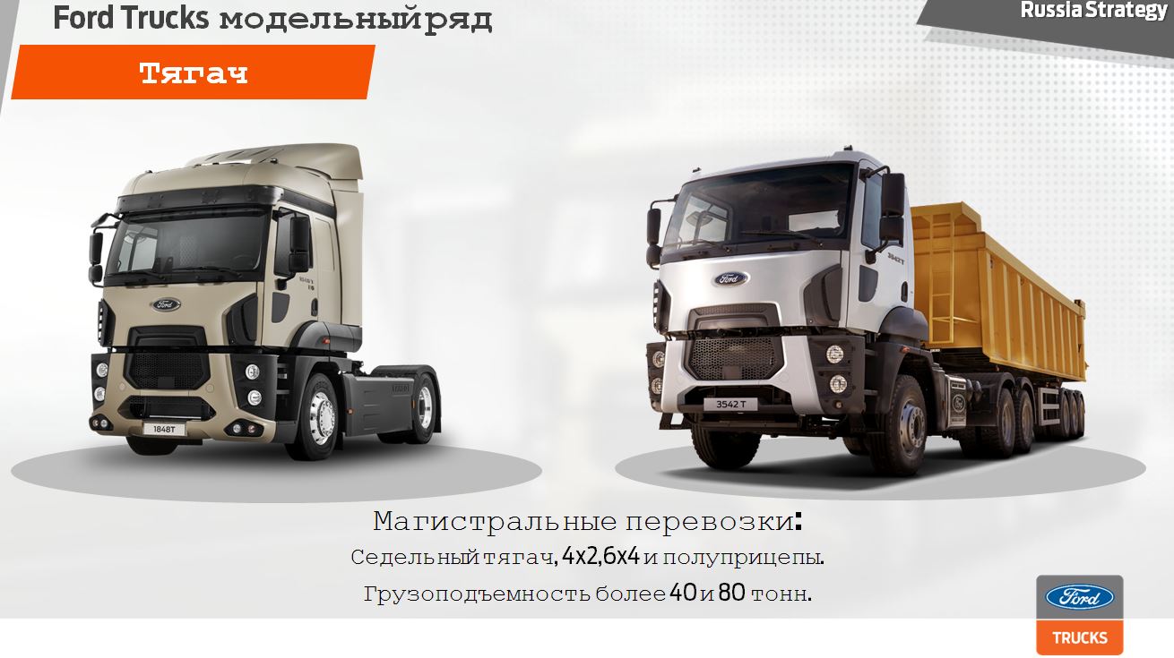 Hence the Ford Truck assumes 25% of its sales will have on exports to Russia. The company involves 4 basic composite element for success in Russia: wide coverage of the country and the creation of international networks; availability and distribution of spare parts and localization of production ("Avtotor"); adaptation of product and services under local conditions and specifics. For example, Russia adapted a new model of tractors 1848T (4x2) and 3542T (6x4) under semi-trailers with the capacity of 40 and 80 tons.