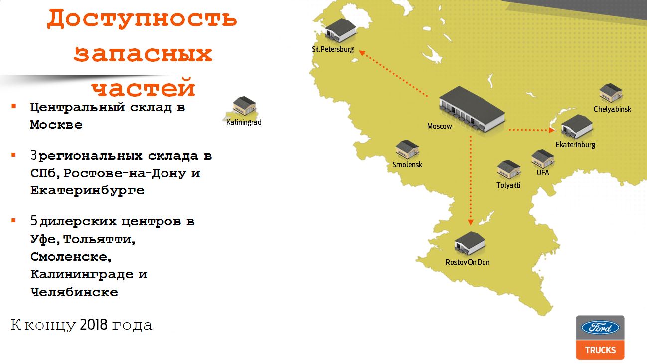 Dealer network in Russia in 2018, will cover 9 cities: Moscow (North), Saint-Petersburg, Kaliningrad, Smolensk, Rostov-on-don, Tolyatti, Ufa, Ekaterinburg and Chelyabinsk. In 2019 dealer network to cover 18 cities, including Voronezh, Moscow (South), Nizhny Novgorod, Kazan, Krasnodar, Volgograd, Novosibirsk, Omsk and Kemerovo. The head office will be in Moscow. The turnover on spare parts assumes sales growth of €25 million, the range of actual goods up to 10 500 items, including a range for all European truck brands, provides its own delivery from "door to door", as well as an online catalog of Ford Trucks.