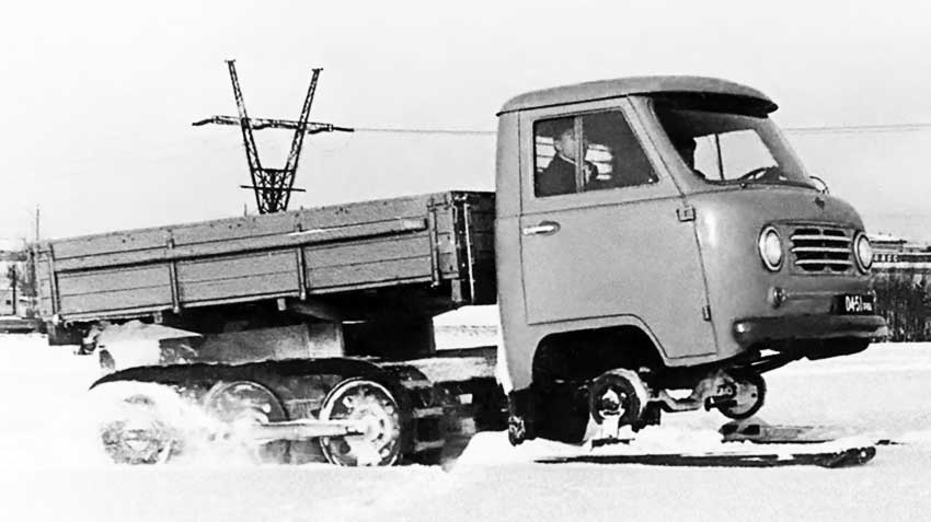 At the end of 1960, work began on snegohodnyh car UAZ-451С, which was equipped with interchangeable, seasonal equipment and to overcome snow and off-road virgin. Instead of the front wheels had installed metal-driven romance, but instead rear — rubber-to-metal caterpillar tracks.