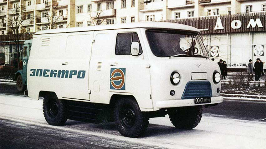 In 1959 the first model of the Ulyanovsk car UAZ-450ЭМ was developed on the base of a serial UAZ-450 UAZ-450A. It was intended for the maintenance of airfields. Electric cars used traction batteries, broken into 2 sections, installed under the floor of the body on both sides in special boxes.